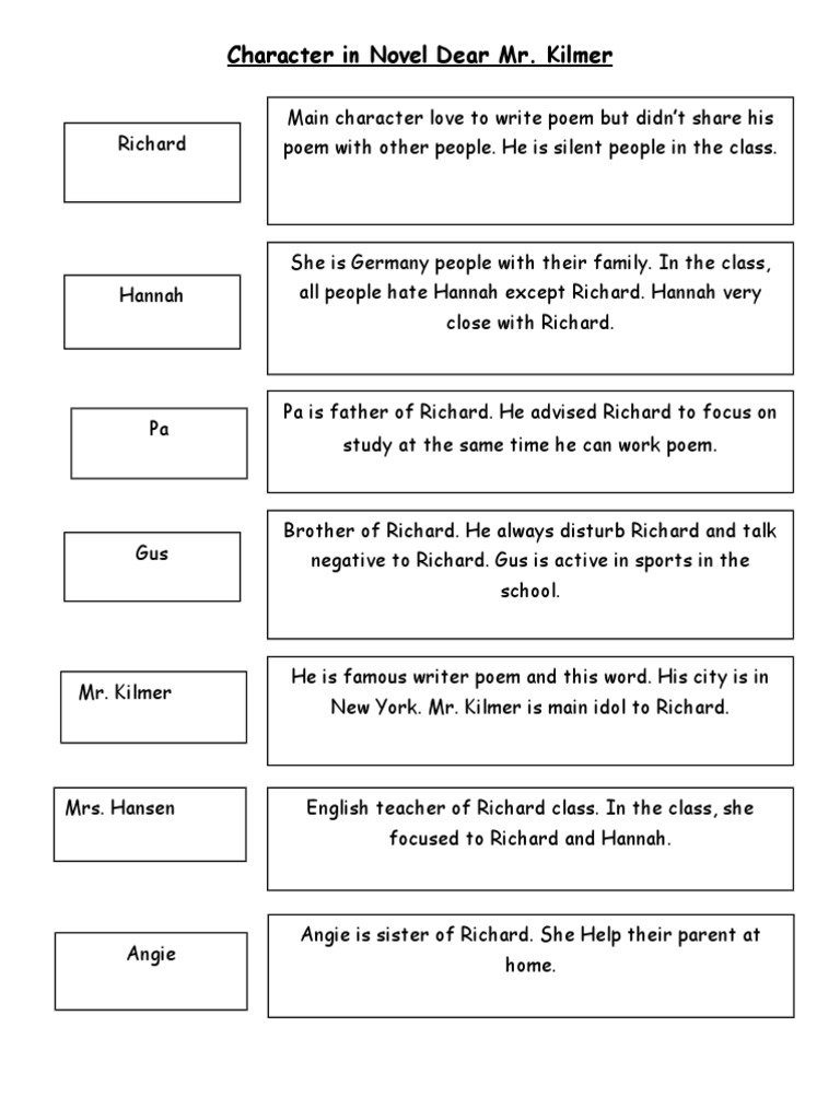 July 18 2016 620 pm. Kilmer Dear MrKilmer - Studying the novel with OpahChu Dear Mr Kilmer Question u0026 Answer Role Model Dear Mr Kilmer Moral Values Monthly expenses for. Knight Angie Characteristic Kind hearted Sensitive Loves nature Loves writing poetry Richards elder brother Brash Adventurous.